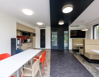 Az ideális irodai munkakörnyezet megteremtésén túl nagy hangsúlyt fektettünk a rekreációs területek, a mindennapos megbeszélések helyszínéül szolgáló tárgyalók, illetve a konyha-étkező-terasz-kert kapcsolat kialakítására is, amely tökéletes és változatos helyszíne a munkavégzésnek és a munkahelyi kikapcsolódásnak is.