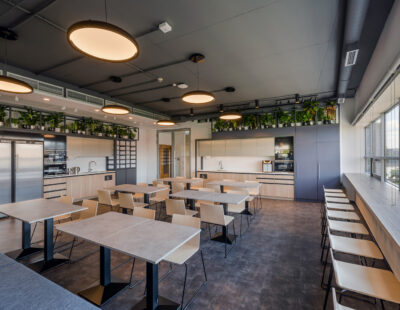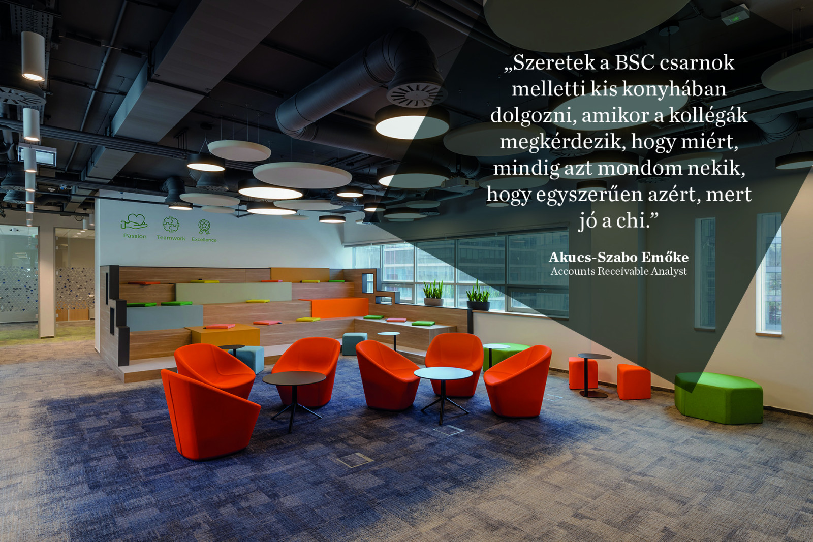 A BSC-ben nem divat az irodán kívül tölteni az ebédszünetetet, a kollégák legtöbbször az ebédlőként is funkcionáló, legmodernebb berendezésekkel felszerelt konyhában, közösen ebédelnek. Az iroda BSC Hall felőli oldalán egy kisebb, ugyanakkor minden igényt kielégítő teakonyha is üzemel, ahol a bárpultnál nemcsak kávézni vagy teázni, ebédelni is kényelmesen lehet. Fontos kiemelni, hogy az irodán valamennyi helyiségében, így a konyhában is kizárólag fa és fém, környezetbarát anyagokat alkalmaztak.